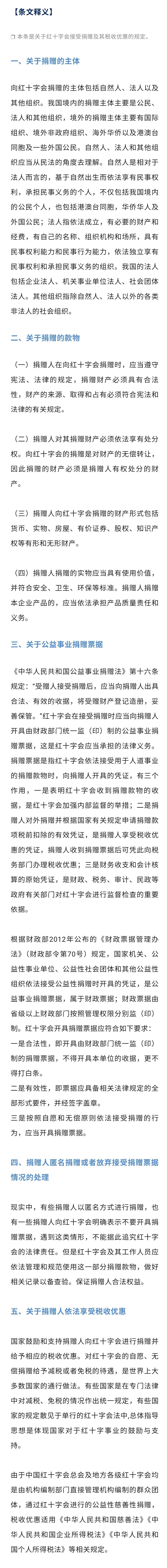 第二十条 红十字会依法接受自然人、法人以及其他组织捐赠的款物,应当向捐赠人开具由财政部门统一监(印)制的公益事业捐赠票据。捐赠人匿名或者放弃接受捐赠票据的,红十字会应当做好相关记录。捐赠人依法享受税收优惠。
