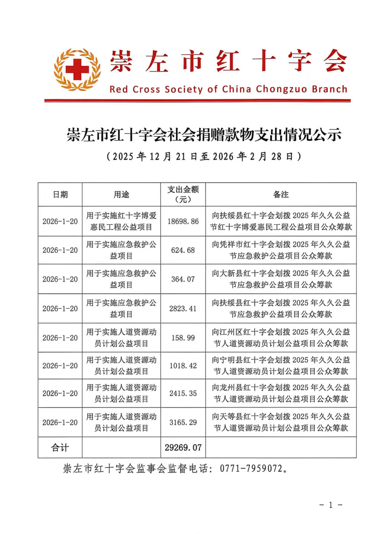 崇左市红十字会社会捐赠款物支出情况公示(2025年12月21日至2026年2月28日)